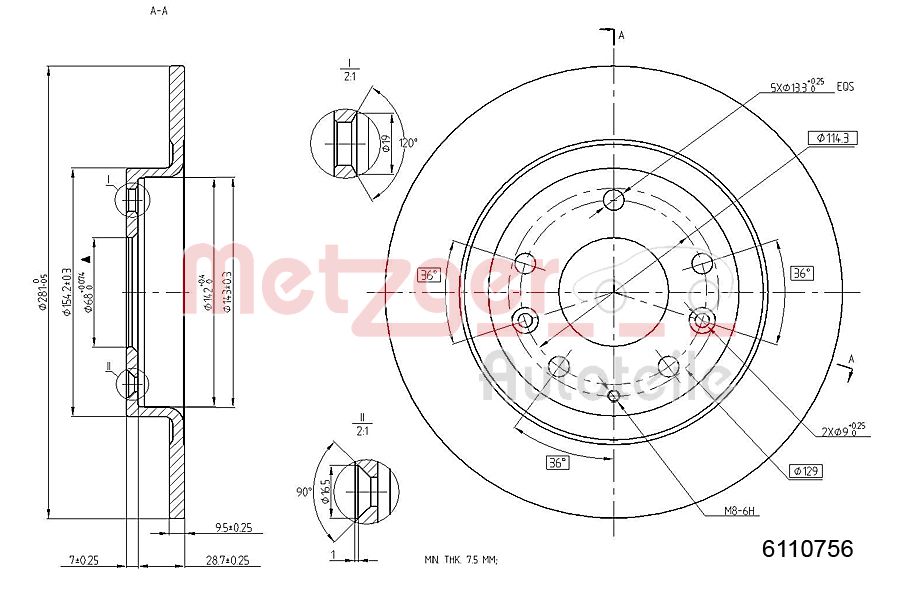 METZGER AUTOTEILE / tarcza hamulcowa Oś tylna / 6110756